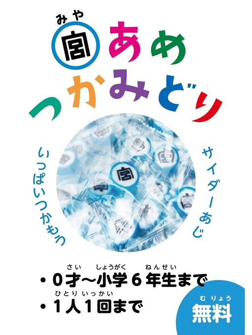 ちなみに写真は、「子ども限定、宮あめのつかみどり」の「ポーズ」です。